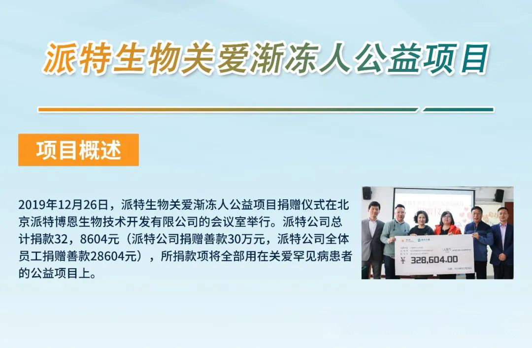 【派特生物關(guān)愛(ài)漸凍人公益項(xiàng)目一助力漸凍人舒暢呼吸】是由蒲公英漸凍人關(guān)愛(ài)中心攜手派特生物公司發(fā)起的公益項(xiàng)目,派特生物總資助金額149000元(拾肆萬(wàn)九仟元整) 。