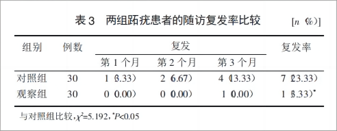 隨訪3個(gè)月,對(duì)照組共有7例復(fù)發(fā)(23.33%),觀察組1例復(fù)發(fā)(3.33%),2組復(fù)發(fā)率比較差異具有統(tǒng)計(jì)學(xué)意義(P<0.05)(表3)。