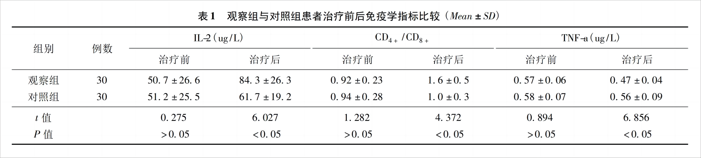 觀察組患者治療后白細(xì)胞介素2(IL-2)、腫瘤壞死因子(TNF-a)以及CD4+/CD8+免疫學(xué)指標(biāo)均得到顯著改善,與對(duì)照組比較差異具有統(tǒng)計(jì)學(xué)意義(P<0.05);