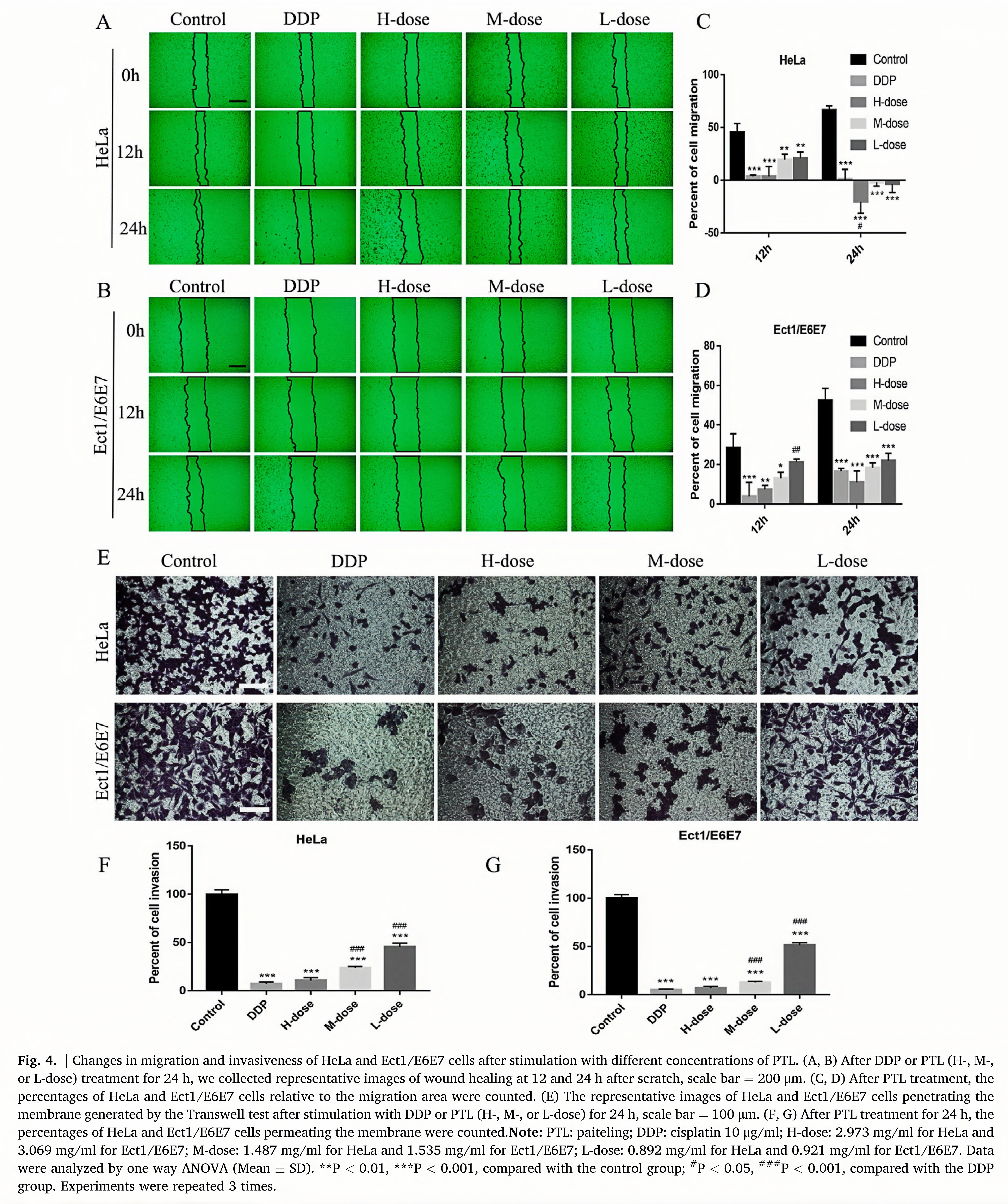 We used a wound-healing test to determine whether PTL can inhibit the migration of HeLa and Ect1/E6E7 cells. We found that PTL signifi- cantly reduced the migration area of HeLa and Ect1/E6E7 cells at 12 and 24  h,  and  the inhibition  was  concentration-dependent  (Fig.  4A–D).  It was assumed that PTL can also reduce the invasiveness of HeLa and Ect1/E6E7 cells. Therefore, we used the Transwell invasion test for cell invasion testing. We observed a gradual decrease in the number of HeLa and Ect1/E6E7 cells passing through the matrigel along with an increase in PTL concentration. The results of the DDP group and the PTL H-dose group are similar (Fig. 4E–G).
