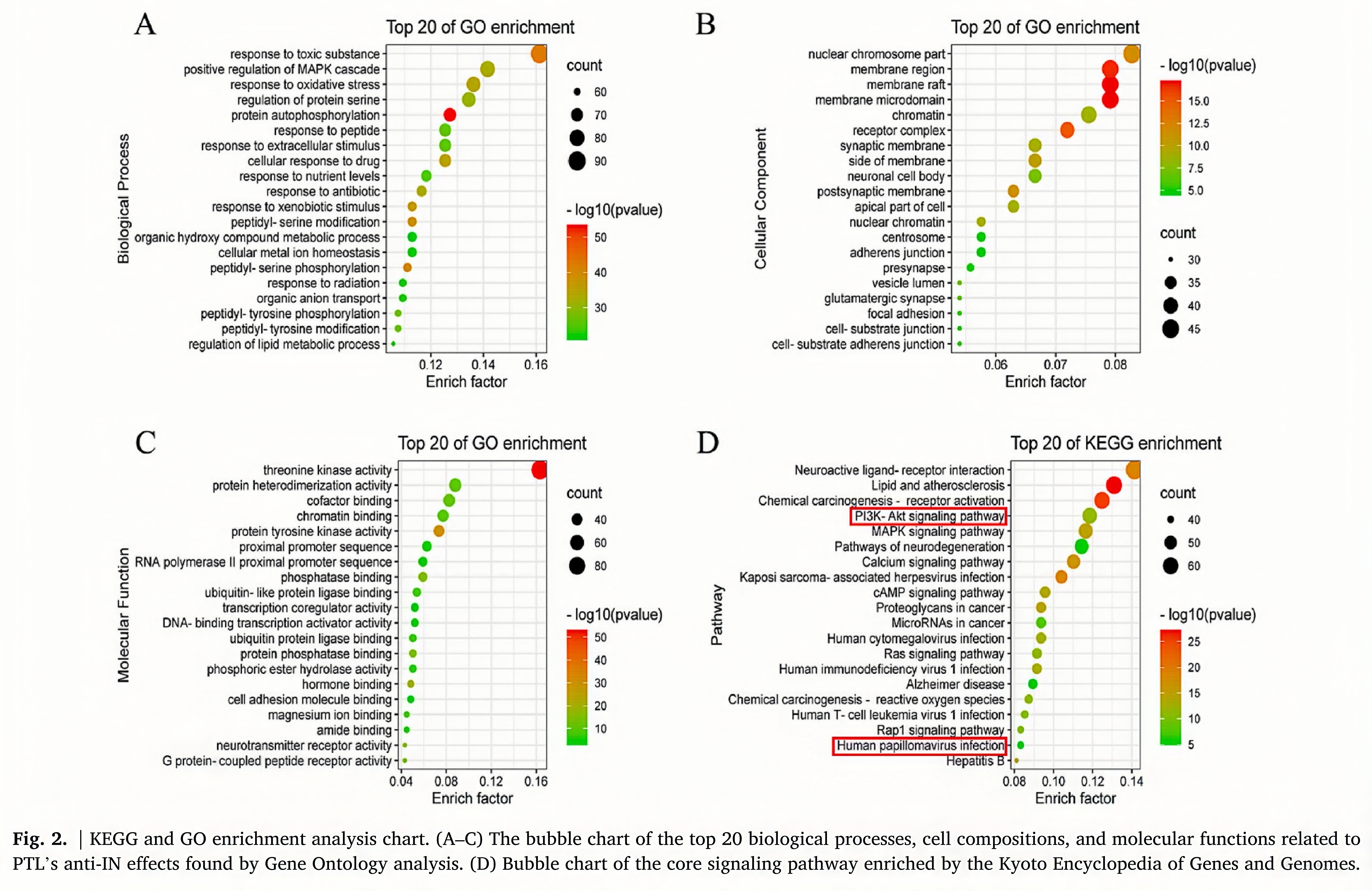 GO analysis revealed that the biological processes related to PTL‘s effects on HPV-mediated IN included protein serine regulation, oxida tive stress response, protein autophosphorylation, response to toxic substances, and cell response to biological stimuli. The main cell components included a nuclear chromosome part, membrane area, and the receptor complex. Molecular functions included threonine kinase activity, protein heterodimerization activity, chromatin binding, DNA transcription activation activity, and ubiquitin-like protein ligase bind- ing (Fig. 2A–C). In order to find the potential pathway of PTL to HPV- mediated IN, we finally enriched the potential therapeutic targets. The related KEGG pathway could be roughly divided into cell proliferation, oxidative stress, immune response, tumor, and virus infection (Fig. 2D). The Pi3k/Akt signal pathway was the most influential pathway. After integrating literature and network pharmacological analyses, we iden- tified the Pi3k/Akt signaling pathway and HPV infection as the key points for studying PTL against HPV-mediated IN. Therefore, we hy- pothesized that the mechanism of PTL effect on HPV-mediated IN may be as follows: PTL can inhibit the key oncogenic proteins E6 and E7 and the Pi3k/Akt signaling pathway of HPV, thereby regulating the growth, proliferation, and apoptosis of epithelial cells infected by HPV.