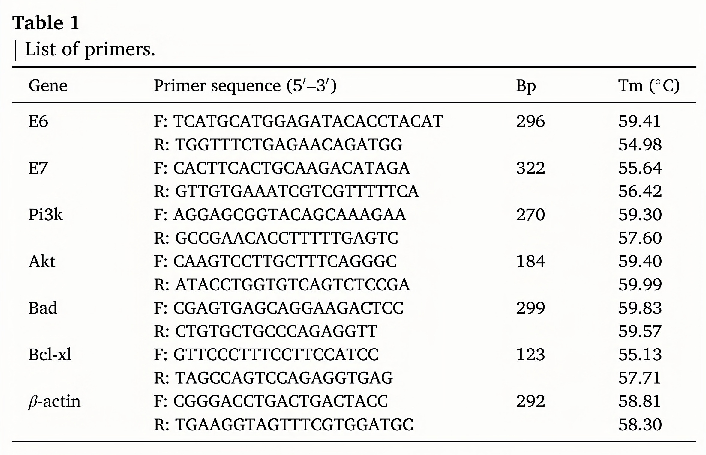 HeLa cells and Ect1/E6E7 cells were divided into 2 experimental groups and treated with PI3KAKT inhibitor LY294002 (20 μM) and activator IGF-1 (100 ngml), respectively (Pei et al., 2020). After each group of cells was stimulated by the corresponding drug for 24 h, the total protein of cells was extracted with radioimmunoprecipitation assay lysate, and the cell protein concentration was detected with bicincho- ninic acid reagent. In the experiment, 50 μg of total protein was added to each  loading  well,  10%  sodium  dodecyl  sulphate–polyacrylamide  gel electrophoresis was used to separate the total protein, and then the total protein was transferred to the polyvinylidene fluoride membrane and blocked with milk for 2 h. The primary antibodies we added included β-actin (1:1000), E6 (1:500), E7 (1:500), Pi3k (1:1000), Akt (1:800), P-akt (1:800), P-bad (1:500), Bcl-xl (1:1000), and Bad (1:2000). After incubating overnight at 4°C, the secondary antibody was added and incubated for 30 min. The membrane was washed with 0.1% TBST for 10 min and then exposed to enhanced chemiluminescence luminescent solution, and the ImageJ software was used to detect the relative expression of the band.