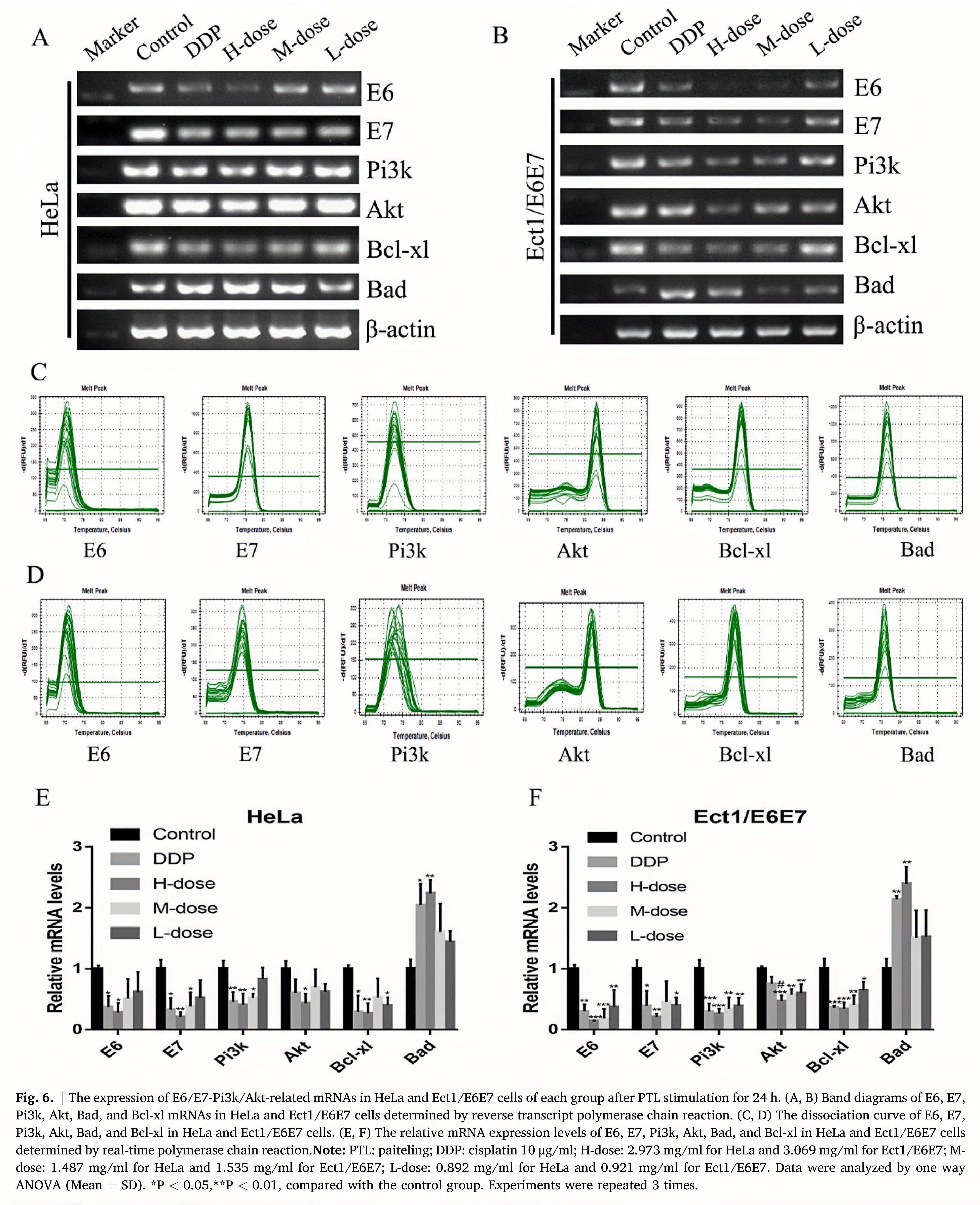 In order to further verify the molecular mechanism of PTL-induced apoptosis of HeLa and Ect1/E6E7 cells, we used PCR experiments to evaluate the relative expression of E6, E7, Pi3k, Akt, Bad, and Bcl-xl mRNAs). We found that after 24 h of PTL stimulation, the relative mRNA levels of E6, E7, Pi3k, Akt, and Bcl-xl in HeLa and Ect1/E6E7 cells were significantly downregulated. On the contrary, the relative mRNA expression levels of the apoptotic gene Bad decreased. The same result was also observed in the DDP group (Fig. 6).