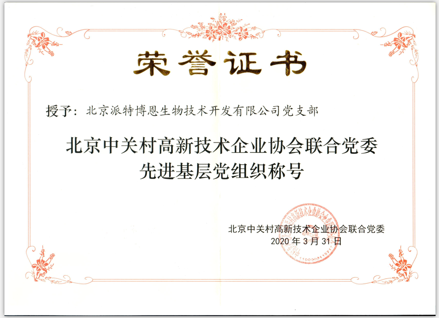 派特公司黨支部自2019年4月15日成立以來(lái),在上級(jí)黨組織的領(lǐng)導(dǎo)下,在派特公司總部領(lǐng)導(dǎo)的大力支持下,積極有序地開(kāi)展了各項(xiàng)黨員活動(dòng)。 派特公司黨支部榮獲“北京中關(guān)村高新技術(shù)企業(yè)協(xié)會(huì)聯(lián)合黨委先進(jìn)基層黨組織稱號(hào)”。