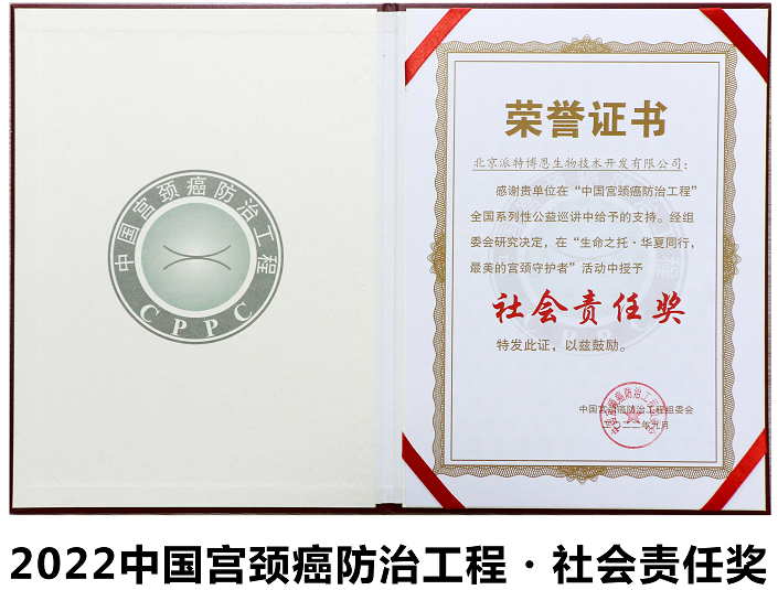 2022年9月,由中國醫(yī)療保健國際交流促進會婦產(chǎn)科分會主辦、山西醫(yī)科大學第二醫(yī)院協(xié)辦的第十屆中國宮頸癌防治工程學術年會暨全國宮頸上皮內(nèi)瘤變及宮頸癌診治熱點論壇順利召開。派特生物再次榮獲中國宮頸癌防治工程“最美的宮頸守護者·社會責任獎”。