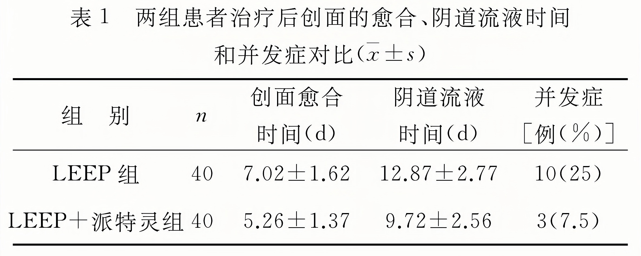 LEEP+派特靈組的創(chuàng)面愈合和陰道流液時間均顯著短于LEEP組(P<0.05);